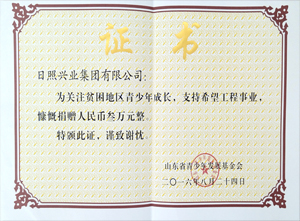 ·2016年8月24日,山東省青少年發(fā)展基金會為興業(yè)集團頒發(fā)“關注貧困地區(qū)青少年成長,支持希望工程事業(yè),慷慨捐贈人民幣3萬元”榮獲證書。