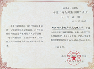 ·2016年8月,日照興業(yè)房地產(chǎn)開發(fā)有限公司獲得山東省工商行政管理局2014--2015年度“守合同重信用”企業(yè)